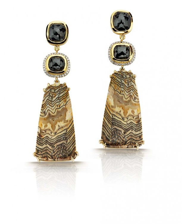 أما بالنسبة للأقراط فقد اخترناها من "باميلا ويزينغا Pamela Huizenga" مكونة من الذهب مع قطع من خشب السيكويا منقوشة بطريقة الحفر؛ إضافة إلى قطع ماسية سوداء على شكل "Rose-cut" وفصوص ماسية بيضاء؛ في تصميم رائع أثمر عن شكل استثنائي وساحر للأقراط يتناغم كليا مع باقي القطع الأخرى للإطلالة.