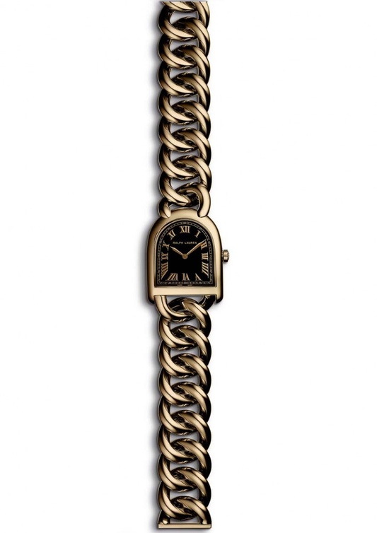 وبالنسبة للساعة، لدينا قطعة من "رالف لورين Ralph Lauren" تعرف بإسم "ستيروب بتيت لينك Stirrup Petite-Link". أبهرتنا هذه الساعة بإطارها الجميل وسلسلة أسورتها الرائعة. تم تصميمها من الذهب الوردي مع مينا مطلية بالورنيش الأسود. وهكذا نكون قد استكملنا إطلالتنا لليوم لتستوحي منها أناقتك وتألقك.