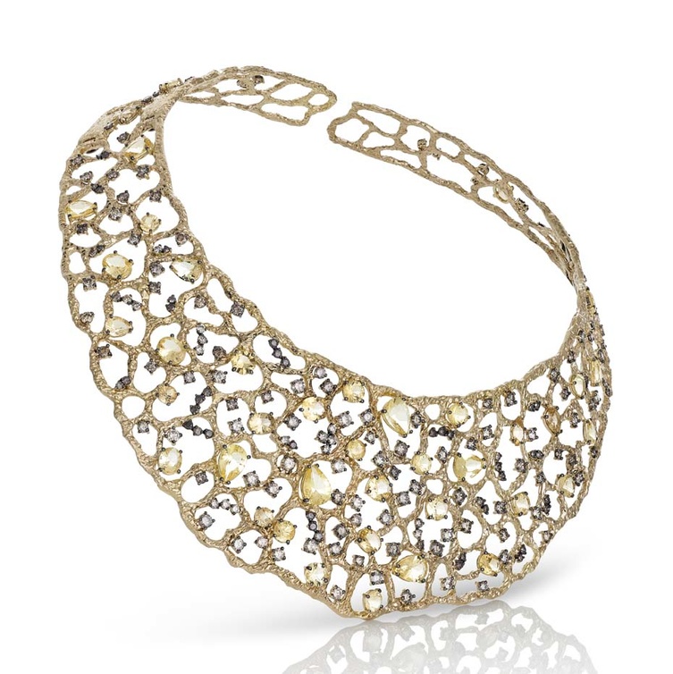لدينا قلادة من "روبرتو كوينRoberto Coin " تعرف بإسم قلادة "تانكويلا بيب Tanquilla bib". قلادة فخمة بارزة تم تصميمها من الذهب الأصفر والأسود مع فصوص ماسية بنية اللون بحلة رائعة و فريدة من نوعها.