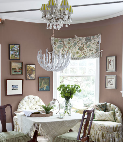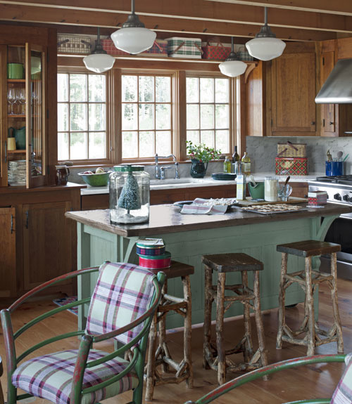- مطبخ بجدران بنية ، تم استعمال اللون الأخضر الفاتح مع الخشبي الداكن لتعزيز الستايل الريفي ، مع مقاعد من خشب البلوط ، بينما تتناغم ألوان المطبخ مع المساحة المخصصة للجلوس ، التي تبدو في شكل كراسٍ مبطنة بقماش مخطط بالأخضر الفاتح وخطوط فوشيا .