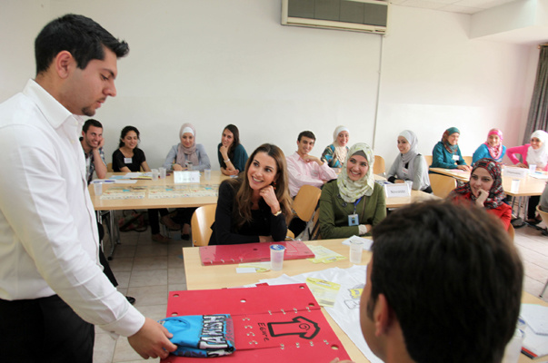 التقت الملكة رانيا العبدالله في الجامعة الألمانية الأردنية مجموعة من طلبة الجامعات المشاركين في إحدى ورش التدريب التي تنظمها مؤسسة إنجاز في إطار برنامجها "الشركة" الممول من قبل وزارة التخطيط والتعاون الدولي، ويهدف إلى بناء قدرات الشباب وتعزيز مهارات العمل لديهم وتشجيعهم على العمل الحر وابتكار فرص عمل جديدة وغير تقليدية.