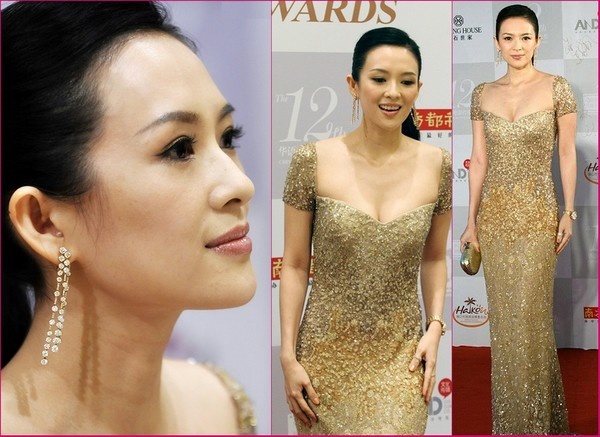 تسي يي تشانغ ارتدت الفستان نفسه فى مهرجان جوائز الإعلام في الصين وبدت متالقة مع الساعة الذهبية والأقراط الطويلة الذهبية أيضا ومنحت نفسها الكثير من الجاذبية بشعرها الأسود الناعم بذيل الحصان.