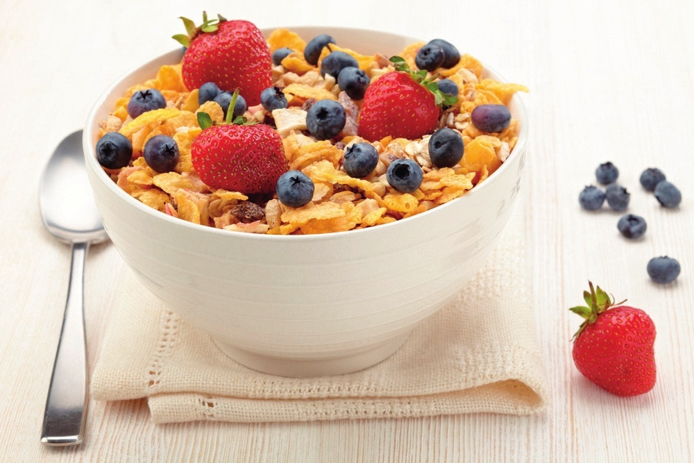 الإفطار: وجبة نشوية عبارة عن حبوب الإفطار (سيريال) مع فاكهة وحليب الصويا.