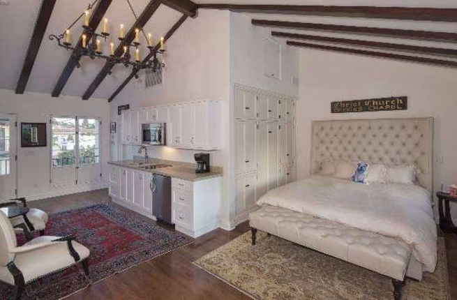 كما تتميز غرفة العائلة بالأسقف العالية والأبواب الفرنسية التي تؤدي للفناء وجناح رئيسي في الطابق العلوي مع شرفة خاصة، كما يوجد بيت للضيوف منفصل مع سقوف مقببة ومطبخ كامل.