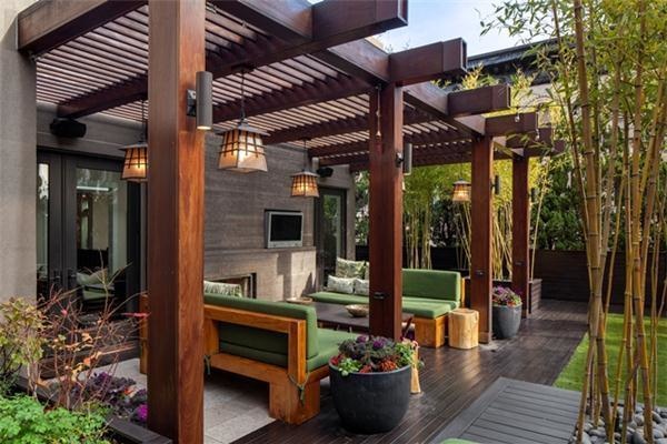 كما يوجد خارج المنزل سطح خاص تبلغ مساحته 3.000 قدما مربعا مع موقد ومنطقة شواء وفناء مغطى وحمام بخار وحمام سباحة ساخن.