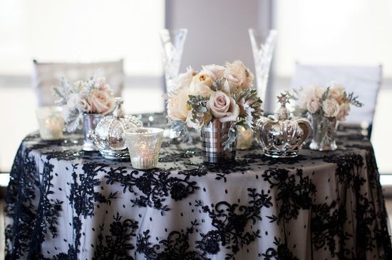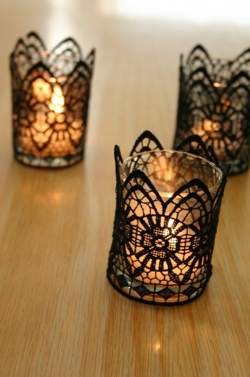 - زينة الطاولات: بإلامكان إضفاء الدانتيل الاسود على الشموع اوالمزهريات التي تزين وسط الطاولات او الاستعانة عنها بشرشف طاولة من الدانتيل الاسود،ووضع ربطة من الدانتيل الاسود على مسند ظهر الكراسي.