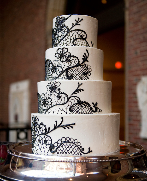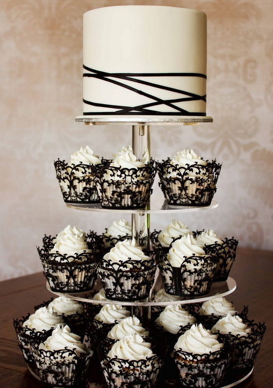 - أكملي التناسق بإختيار الكعكة المزينة بالشوكولا الاسود وبنقشات الدانتيل،كما بإمكانك إختيار الكاب كيك بنفس النقشات ،فإنها ستضفي جواً مكملاً في الحفل.