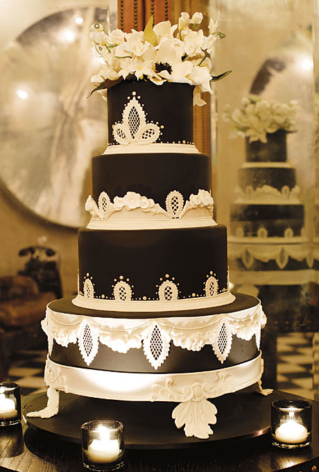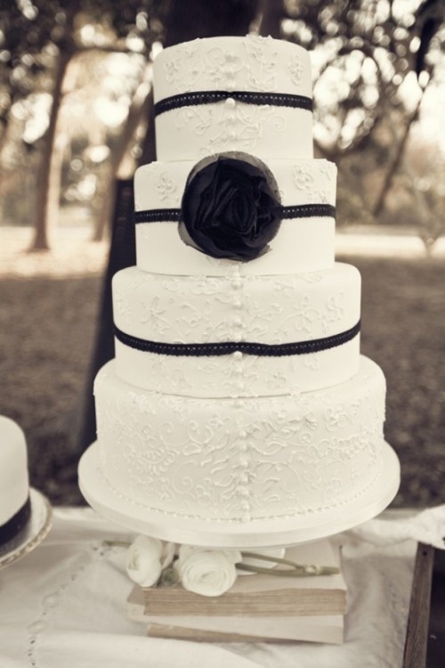 وليس بالضرورة ان يسيطر اللون الأسود في الكعكة على تصميمها إذ لمسة صغيرة منه  تضفي عليها رونقاً مميزاً،كما يضفي شريط الساتان او الدانتيل الاسود على فستان الزفاف الابيض نفس الرونق ،فتناقض هذين اللونين هو ما يميز تمازجهما الرائع معاً.
