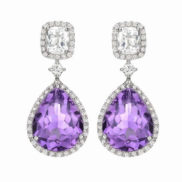 ولتكتمل إطلالة العروس إخترنا لها مجوهرات قمة في الجمال والرقي... فمن Kiki McDonough وقع الخيار على تصميمين رائعين باللون البنفسجي المشع ولمسات من الماس المميز.