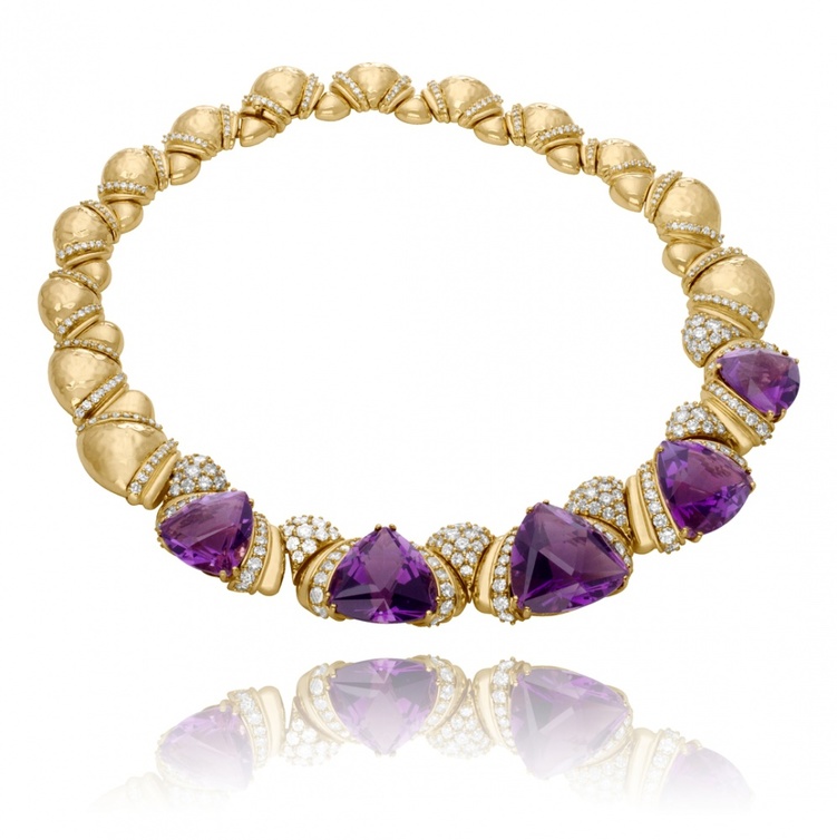 ولتتوهج إطلالتك كان لا بد من إختيار عقد مميز بلون بنفسجي وبتصميم قمة في الأناقة... انه مزيج من الذهب الأصفر والزمرد والماس.