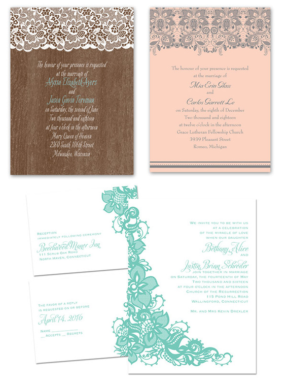 وتقدم مجموعة Ann’s Bridal Bargains دعوات زفاف مصممة بالدانتيل بجميع أنواعه الخشبي والرومنسي والأنيق حيث يطلق عليها:Woodgrain Lace, Lacey Romance, Lovely Lace. ونقدمها لكم بالصور لتستمعوا باختيار الدعوة المناسبة لكم.