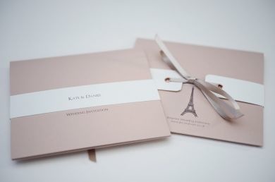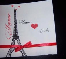 -دعوة الزفاف :  إعتمدي على دعوة الزفاف المزينة ببرج إيفل التي توحي مباشرة بفكرة الحفل الذي تعتمدينه والمستوحى من السحر الباريسي.