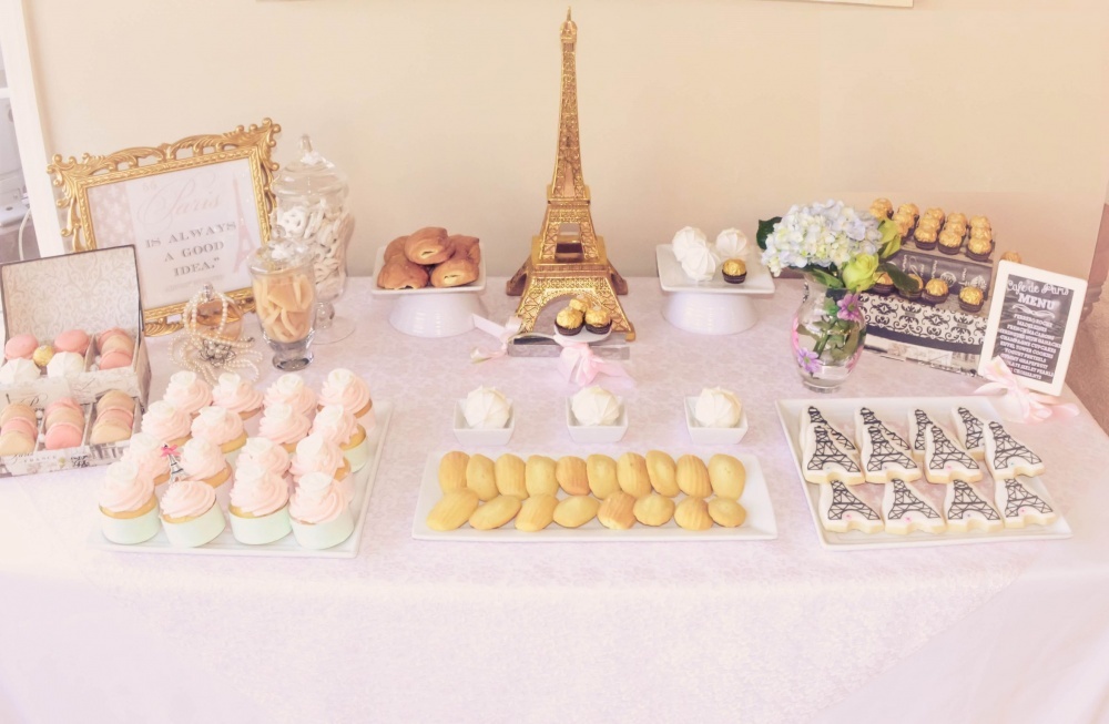 -الحلويات: لما لا تزينين طاولات حلوياتك  بلمسات باريسية أنيقة من برج إيفل الى إختيار واحدة من أجمل الماركات الفرنسية العريقة إذا كنت من عاشقات الموضة الباريسية،فتخالرين إسم ماركة أو زجاجة عطر مفضلة لديك أو غيرها من الأفكار.