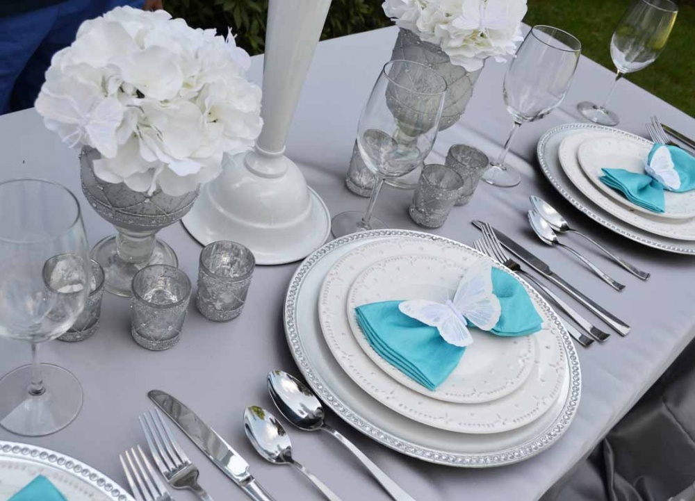 وتجدر الإشارة الى ان اللون الفضي يعكس جمالاً إستثنائياً على اللون الفيروزي، ويضفي  إشراقاً لا مثيل له على تفاصيل ديكور حفل الزفاف.