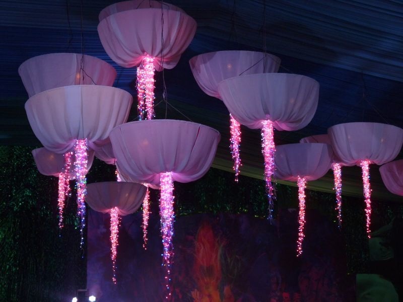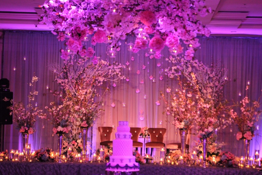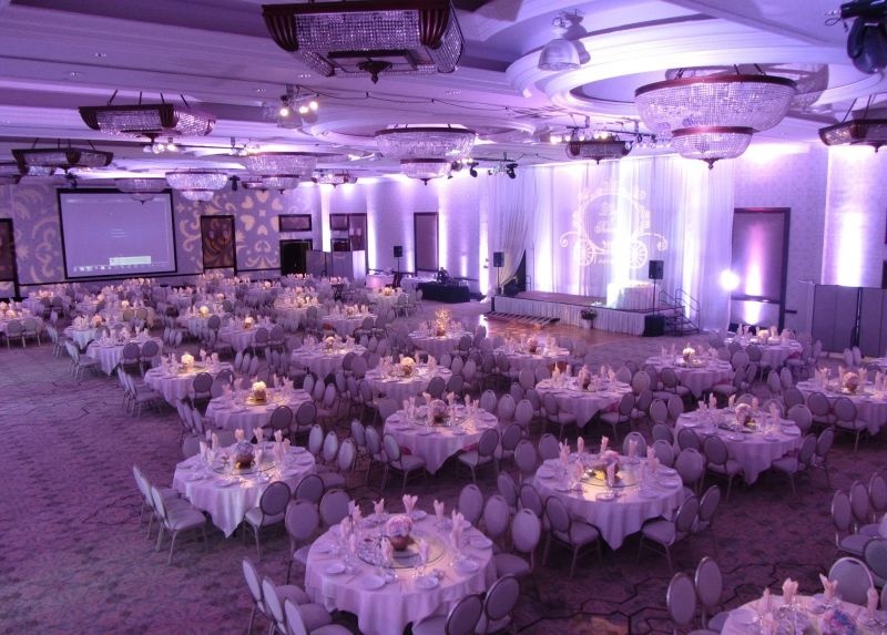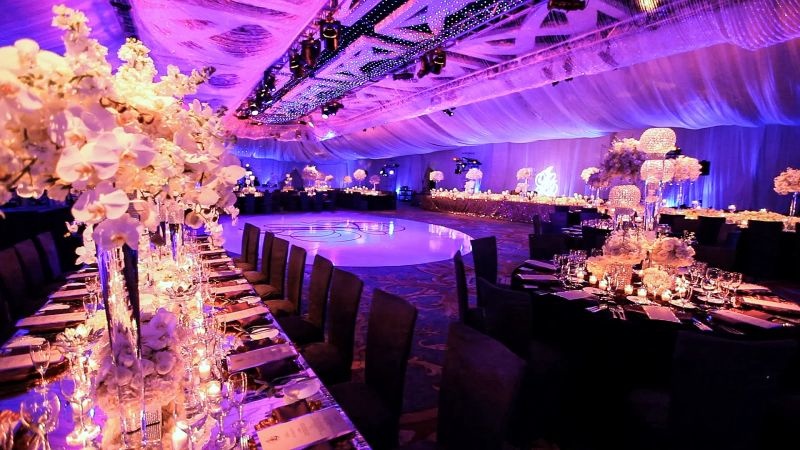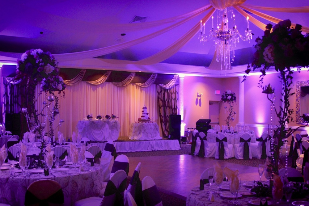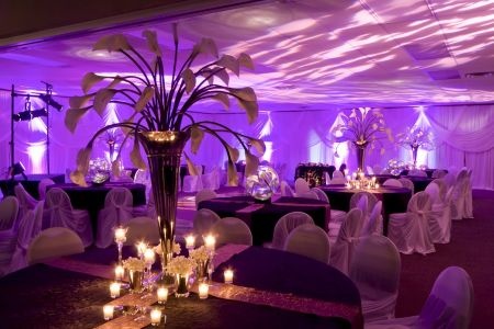 -الإضاءة: ان الإضاءة البنفسجية في قاعة الزفاف تضفي رونقاً ملوكياً لا مثيل له، وتجعل الأجواء تبدو بكامل سحرها ورومنسيتها .