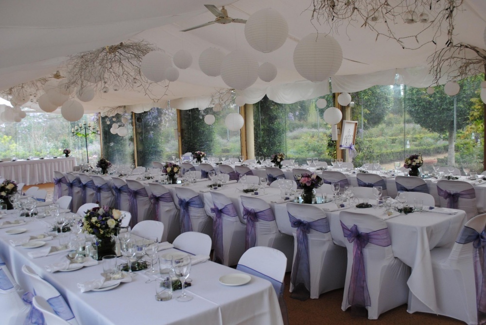 -أغطية الكراسي والطاولات: إذا لم ترغبي باللجؤ الى التفاصيل البنفسجية، بإمكانك الإعتماد على الألوان الشفافة او البيضاء وإختيار أغطية الكراسي والطاولات باللون البنفسجي الهادئ، مع إضفاء لمسات فضية الى اللون البنفسجي لكسر حدته خصوصاً اذا اخترت اللون الداكن منه.