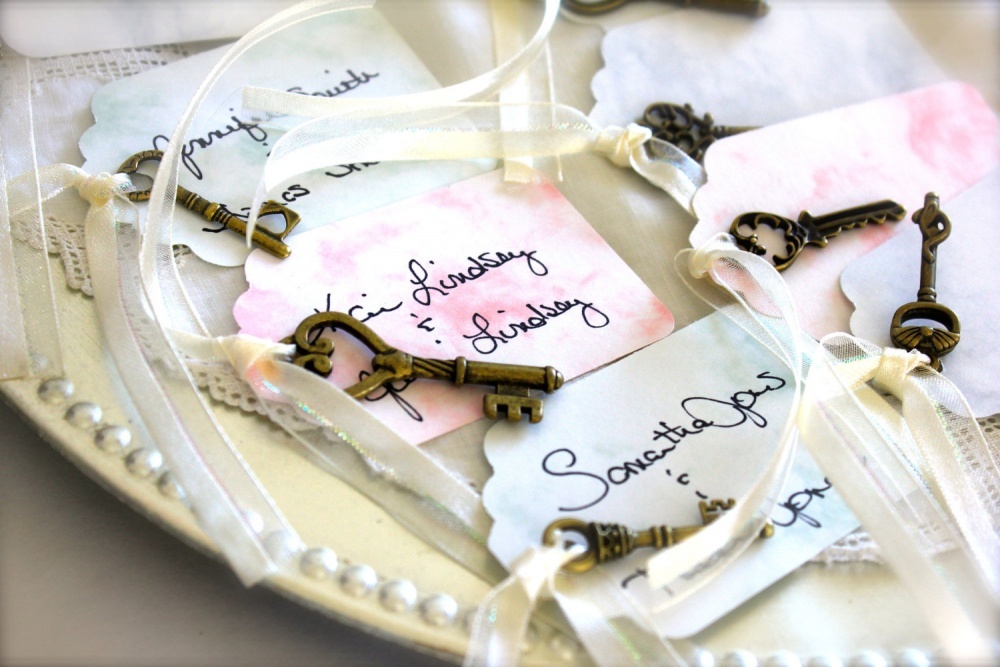 يمكنك شراء هذه المفاتيح من محلات بيع الأغراض القديمة وإضافة إليها عدد من البطاقات المقصوصة على شكل قلب والمطبوع عليها عدد من الكلمات الجميلة التي ترغبين في قولها في هذا اليوم المميز، وقومي بتوزيعها بعد ذلك على ضيوف حفل زفافك وشاهدي دهشتهم من هذه الإضافة الجميلة للحفل.