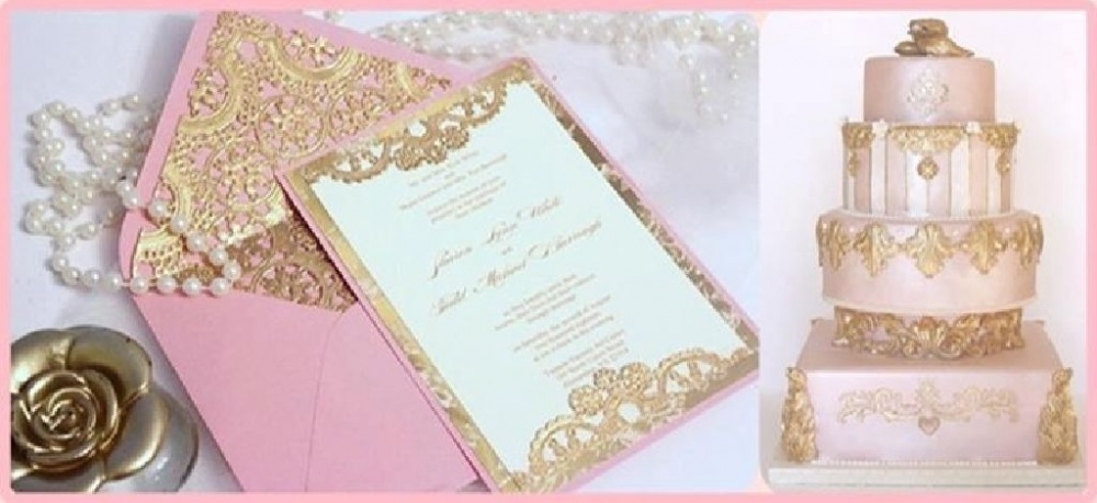 -لتتزين بطاقة الدعوة باللونين الذهبي والوردي لتعبر عن ذوقك الخاص، وتكون بمثابة مقدمة لما ينتظره المدعوون في حفل زفافك.