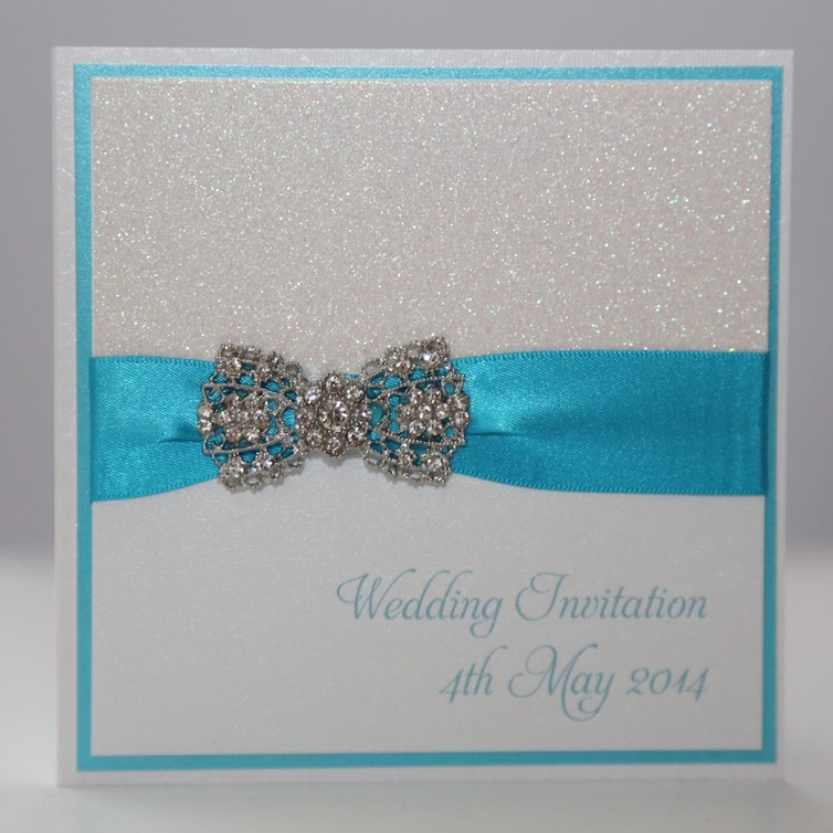 -إختاري بطاقة الدعوة لزفافك باللون التركوازي الكامل او  اللون الأبيض التقليدي الذي تدخل عليه شرائط الساتان الحريرية.