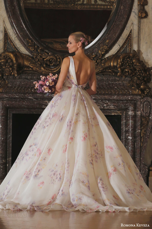 -فستان مطبع بالورود الناعمة: إن موضة فساتين الزفاف لربيع 2016 هي للفساتين المطبعة بالورود الناعمة كالتي ظهرت في مجموعة فساتين Romona Keveza.