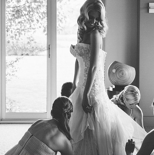 صديقات وأقارب العروس أثناء مساعدتهن لها في ارتداء فستان الزفاف