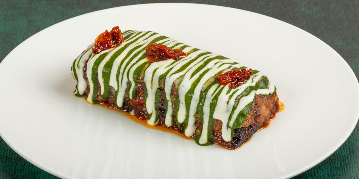 طبقات الباذنجان المخبوزة مع كريمة البوراتا ولمسة بيستو الريحان