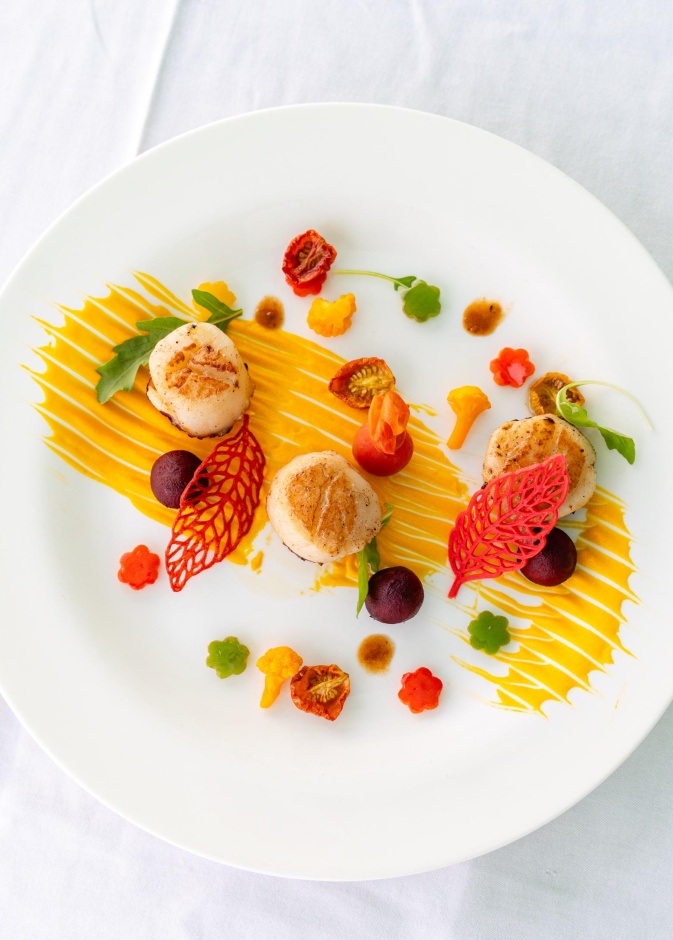 إسكالوب مشوي في المقلاة؛ وصفة مميزة لتحضير الاسكالوب الطري بشكل مقرمش ورائع، يقدمه لك الطهاة في منتجع وسبا جزيرة ماتشافوشي المالديف، مع بوريه الجزر، تفاح أخضر مخلل، وفلفل كونفيه