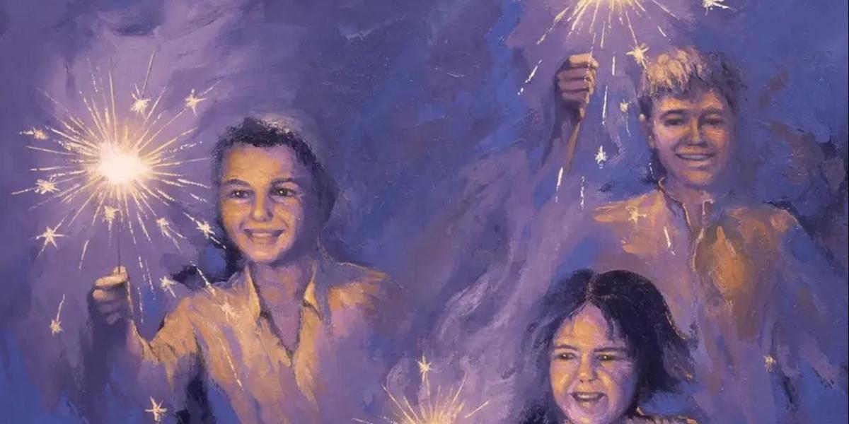 يلتقط الفنان ضياء عزيز ضياء في هذا العمل واحدة من أكثر لحظات العيد بساطة وصدقًا: فرحة الأطفال. تظهر الشخصيات وهي تمسك بالألعاب النارية، في مشهد ليلي يغلب عليه اللون الأزرق، تقطعه ومضات الضوء المنبعثة من الشرارات.