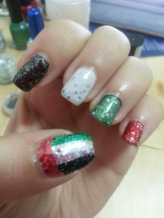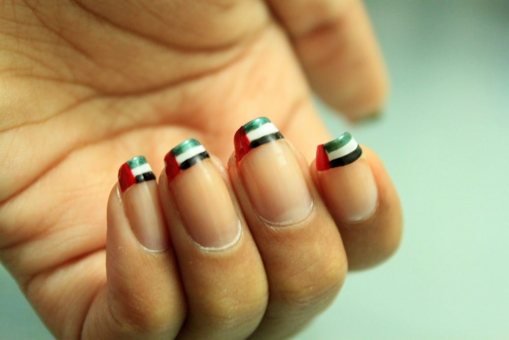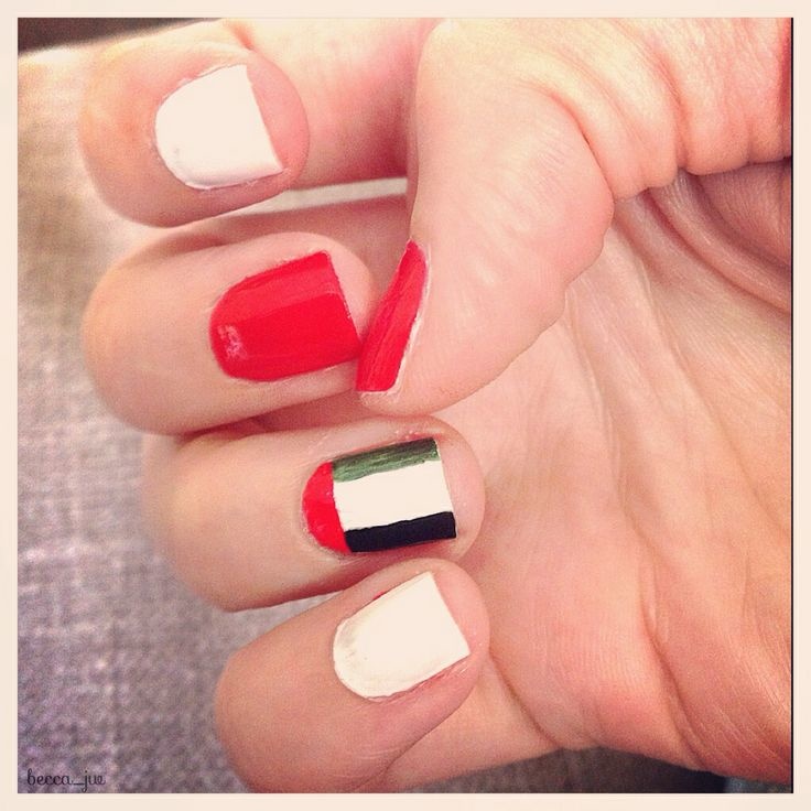 يحمل العلم الإماراتي ألوان الحب والطبيعية والأرض الناصعة والنابضة بالحياة. بألوانه الأربعة التي تتألف من الأبيض والأسود والأحمر والأخضر، زيّني أيتها المرأة أظافرك هذا العام، وانتقي الشكل الذي ترغبين بتطبيقه وزخرفته.