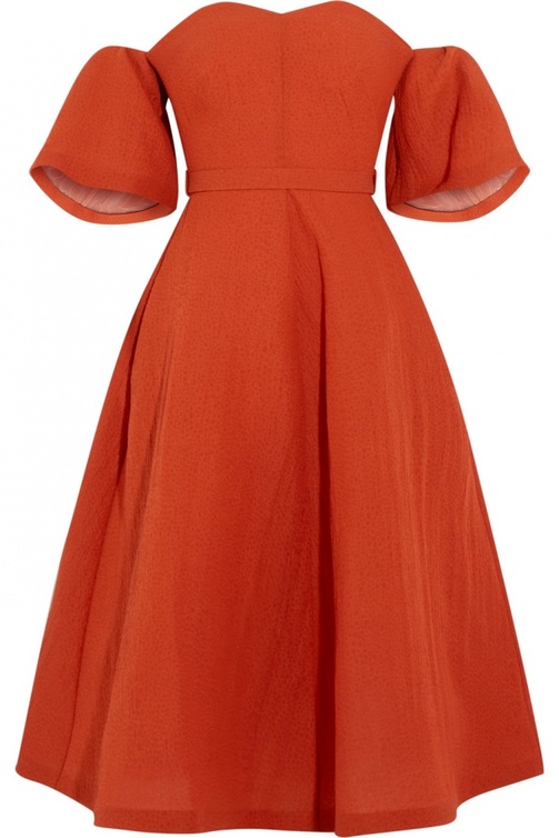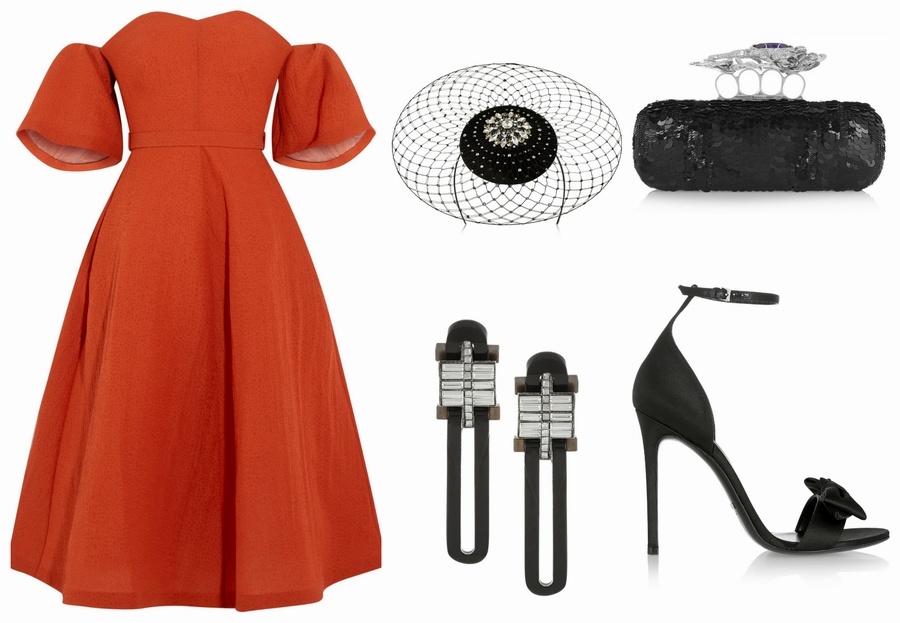 الإطلالة الثالثة: كلاسيكية مستوحاة من الخمسينيات، لكن فيها طبعاً لمسات عصرية رائعة. عبارة عن فستان مميز بأكتاف مكشوفة من VikaGazinskaya باللون البرتقالي الهادئ. مع حذاء ساندال أسود من Gucci، وحقيبة يد من الترتر الأسود البرّاق من Alexander McQueen، وأقراط سوداء من Lanvin. وقبعة جنيلي للرأس من الشبك السود ومُرصّعة بحبات الكريستال الفاخرة.