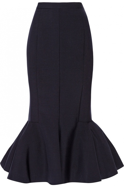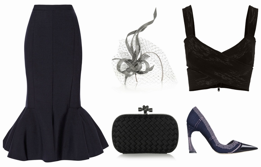 الإطلالة الأولى: مميزة بالأسود والكحلي وتجمع بين العصرية والأناقة عبارة عن تنورة بقصة ضيقة بخصر عال وتتسع من الأسف من Julien David، مع توب قصيرة بقماش لامع من Donna Karan، وحذاء بتصميم رائع من Dior، وحقيبة يد صغيرة من BottegaVeneta، وقد اخترنا للإكسسوار سوار يد من Alexander McQueen، وزينة للرأس مع شبك يُغطي الوجه من Philip Treacy.