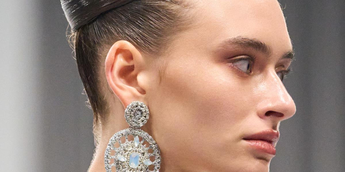 من الاطلالات الجمالية المميزة التي تستحق التوقف عندها، تسريحات الشعر النصفية والمبللة المسحوبة بالكامل الى الخلف على طريقة دار Krésha Bajaj. فتألقي بأجمل تسريحات الشعر النصفية والمبللة ذات التموجات الكاجوال والعصرية التي تضمن لك اطلالة جمالية طبيعية وبسيطة. هذه التسريحة طبّقيها مع سحب الشعر على الجوانب بطريقة مترابطة، واحرصي على تطبيقها مع اسدال الخصل المالسة على الظهر بطريقة مبللة وطويلة.