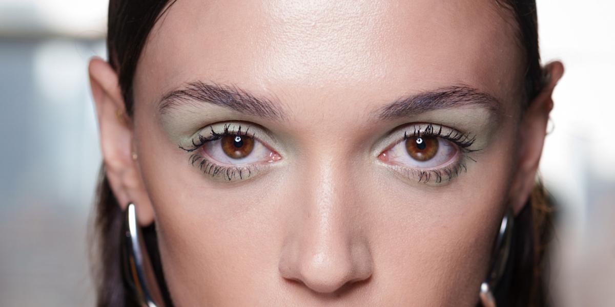 كما طبّقي في إطلالاتك المقبلة مكياج عيون مشرق مع رسمات الظلال الخضراء المات بطريقة تجعل عينيك أوسع. اختاري بأسلوب دار Kiko Kostadinov صيحة الظلال الفاتحة وذلك من خلال سحب الخطوط البارزة على الجفنين العلوي والسفلي من وسط الجفون الى الخارج، مع اضاءة الجهة الداخلية للعينين باللون الازرق لتوسيع سحبة العينين.