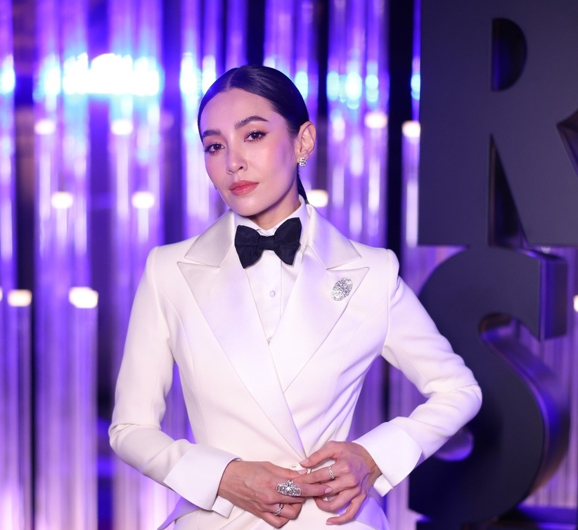الفنانة سلمى ابو ضيف كذلك اعتمدت المكياج البرونزي للبشرة بأنامل شريف طانيوس، وظلل عينيها بين باللون الابيض المائل للفضي المتناغم مع لون فستانها الأبيض، فبدت بغاية الجاذبية.