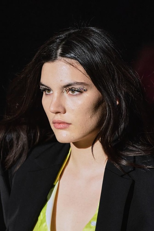 كما يمكنك اختيار في سهرات خريف 2021 أجمل رسمات مكياج فضي براق من خلال تمرير التدرجات الجليتر الجريئة والساحرة. فاختاري من دار Coperni حبيبات الستراس الفضية البراقة بشكل دائري جريء على الجهة العليا للعينين بطريقة هندسية مع الحفاظ على جمال البشرة الموحدة والخالية من المكياج للحصول على نظرة ساحرة وملفتة للنظر.