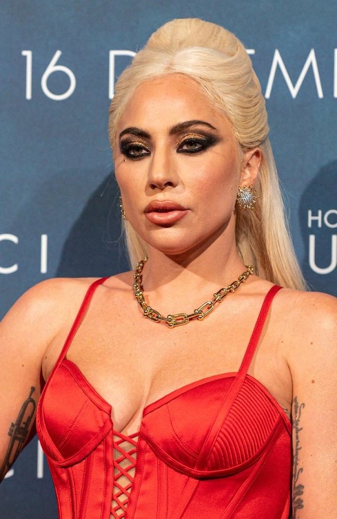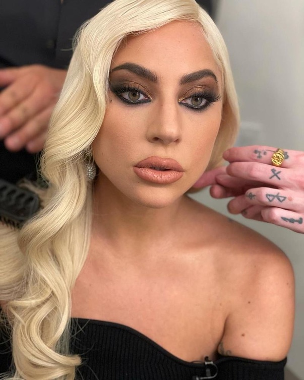 رسمات مكياج عيون ليدي غاغا برزت عام 2021 من خلال تمرير تدرجات ظلال الغليتر القوية مع لوني البنفسجي الداكن والفضي بأسلوب مميز، مع تمرير خطوط الكحل الأسود العريض على الجهة الخارجية للعينين. كما لم تتخلى ليدي غاغا عن تطبيق رسمات المكياج البراق بطريقة قوية ومسحوبة على كامل الجفون العليا والسفلى بحدٍّ سواء، مع اختيار الوان احمر الشفاه المشمشي اللماع والكونتور الكريمي الداكن.