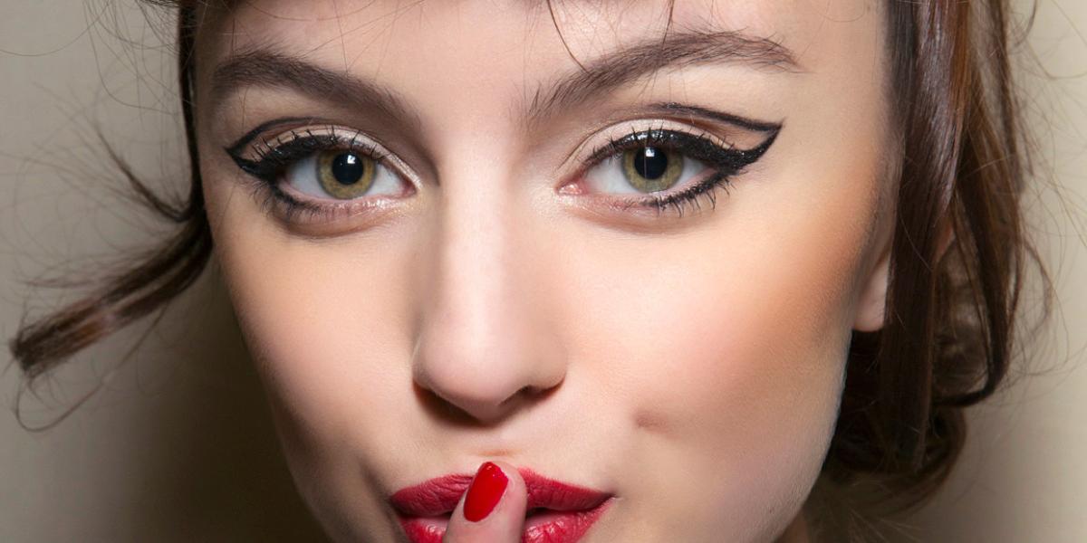 - رسم الجناح السفلي: باستخدام قلم كحل سائل (Eyeliner) بريشة دقيقة، ارسمي خطاً يبدأ من منتصف خط الرموش العلوية ويمتد للخارج وللأعلى باتجاه نهاية الحواجب.
