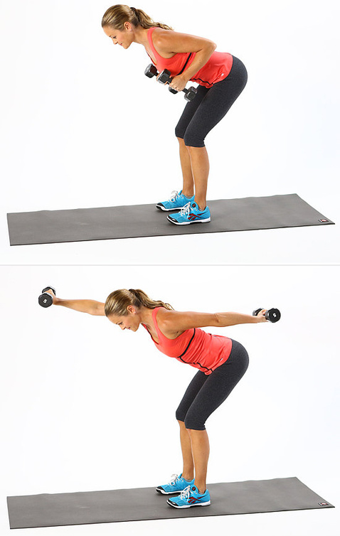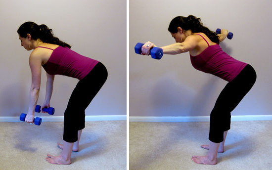 -قفي بشكل مائل النصف العلوي من الجسم الى الأمام، وإحملي الأوزان وإثني الذراع اليمنى ليكون الساعد الأيمن مواز للأرض، ثم إرفعي الذراع إلى الخلف لتكون مشدودة تماماً وكرري نفس التمرين لليد اليسرى.