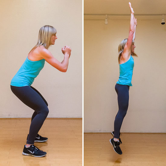 -إتخذي وضع القرفصاء مع الإمساك بوزن خفيف وضعيها أمام منطقة الصدر، بعد ذلك إنهضي مع فرد ذراعيك للأمام وإدفعي بالكرة حتى تواجه منطقة الصدر.