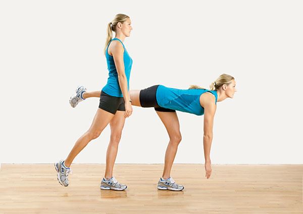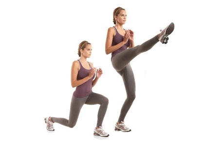 تمرين الـLunges له قدرة رائعة على بناء العضلات وزيادة قوتها. قفي بشكل مستقيم، وضعي اليدين بجانب الوركين وتقدمي بخطوة كبيرة الى الأمام مع ثني الركبة بزاوية 90 درجة ثم إدفعي رجلك التي ثنتيها في الوضعية الأولى الى الأمام وإركلي بكل قوتك في الهواء ثم إسحبيها الى الوراء لمعاودة تكرار التمرين مرات عدة.