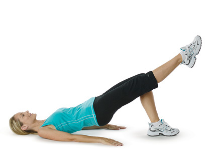 يبدأ هذا التمرين بوضعية تمرين الـBridge  الأساسية. إستلقي على ظهرك على الأرض مع ضم الأرداف ورفع الركبتين وثنيهما ومديّ ذراعيك على الأرض كما في الصورة، وإرفعي أردافك وإضغطي عليهما بإحكام قدر الإمكان وإرفعي القدم اليسرى في الهواء وحافظي على هذه الوضعية لبعض الوقت ثم إخفضيهما من دون لمس السجادة. كررّي هذا التمرين مرات عديدة لكل قدم.