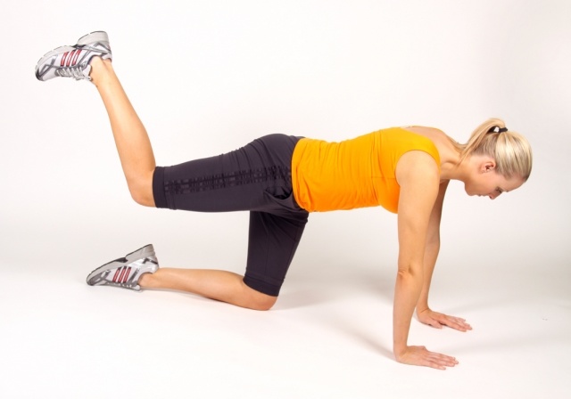 إستندي على ركبتيك كما في الصورة وإتخذي الوضعية كما تظهر لك الصورة، إدفعي بقدمك اليسرى أو اليمنى الى الخلف مرات عدة قبل أن تعيدي التمرين نفسه للقدم الأخرى.