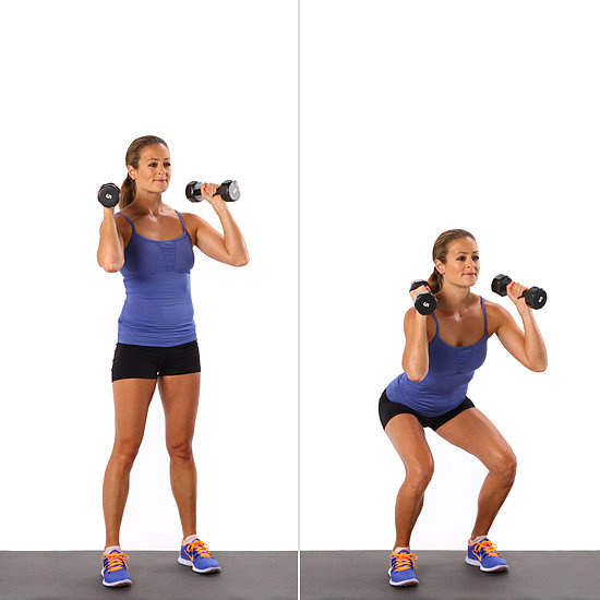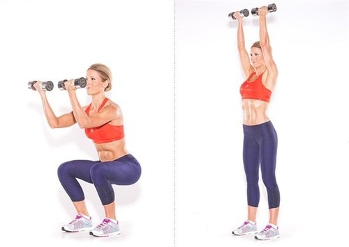 التمرين المعروف بالـSquat أو القرفصاء كما في الصور، يشكل جزءاً طبيعياً يومياً من التمارين إذ إنه يساهم ليس فقط في تنحيف الجسم بل يقوم بتدريب كامل عضلات الجسم السفلية مثل عضلات البطن، الحوض، الساقين والعضلات المسؤولة عن القوة والتحمل. إستخدمي الأوزان الخفيفة من الدامبلز Dumbbells ثم إنزلي من خلال إرجاع مؤخرتك الى الوراء وثني الركبتين، وعند الوقوف مدّي ذراعيك بشكل مستقيم الى الأعلى كما في الصورة.