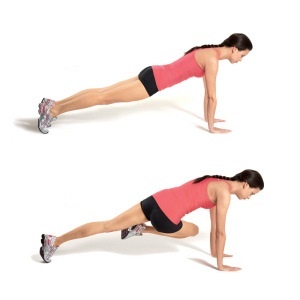 أخفضي الجسم وارتكزي على أطرافك الأربعة وكأنك في وضعية الـPush-Up ، ثم ارفعي الركبة اليمنى واليسرى وقربيها بسرعة إلى منطقة الصدر وانطلقي عن طريق القفز من جهة الى جهة.