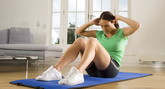 إستلقي على الأرض وإثني قدميك، إرفعي رأسك وجسمك الى الأعلى وثبتي يديك خلف الرأس. إفردي الذراعين حالما تصلين على مستوى الركبة، ثم عودي الى الخلف كلياً وإستلقي مجدداً على الأرض وكررّي التمرين. يمكنك إضافة بعض الحركات على هذا التمرين، من خلال إبقاء الوضعية الأولى ورفع الجزء العلوي صوب ناحية اليمين أو الشمال.
