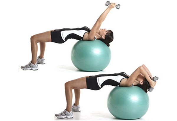 ستستعينين في هذا التمرين بالأوزان Dumbbells، فاختاري الوزن المثالي الذي لا يشعرك بالتعب. يمكنك القيام بهذا التمرين على الكرة الرياضية الثابتة أو على السجادة المخصصة للرياضة. إستلقي على ظهرك واثني الركبتين 90 درجة على الأرض، واحملي الأوزان بين يديك وارفعيهما في الهواء صوب السقف بشكل مستقيم، ثم اخفضي ببطء الدامبلز وارجعيهما خلف أذنيك، وتأكدي من الحفاظ على مرفقيك مباشرة فوق كتفيك. كرّري التمرين 30 مرّة تقريباً.