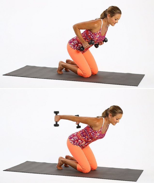 إركعي على ركبتيك، واحملي الأوزان بين يديك، تقدمي قليلاً الى الأمام واثني مرفقيك عند 90 درجة وقربيهما صوب صدرك، ثم قومي بإرجعهما خلف ظهرك كما في الصورة. حافظي على استقامة الظهر والرأس خلال تأدية هذه الحركات. كرّري التمرين أيضاً 10 مرات لـ10 مجموعات.