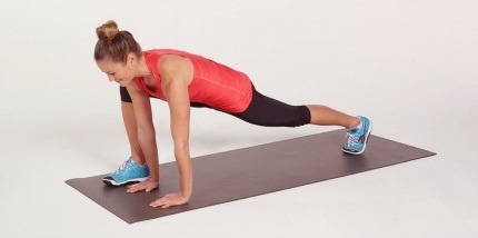 قومي أولاً باتخاذ وضعية الوقوف العادية، ثم ادفعي قدمك اليمنى واثنيها إلى الأمام كما في الصورة وارتكزي على يديك ومدّي الذراعين. حافظي على القدم الثانية ممدودةً في الخلف واحملي إذا استطعت الأوزان الخفيفة بين يديك.