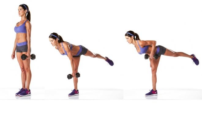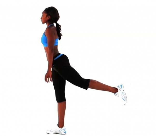 قفي في الوضعية الأولى بشكل مستقيم، واحملي الأوزان الخفيفة في يدٍ واحدة. إنخفضي ببطء إلى الأسفل ومدّي ذراعك مع الوزن صوب الأرض ثم إثني المرفق وارجعيه إلى الخلف وارفعي القدم من الجانب نفسه إلى الأعلى حتى تصبح يدك بموازاتها كما تظهر لكِ الصورة وحافظي على توازنك قدر استطاعتك.