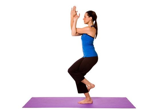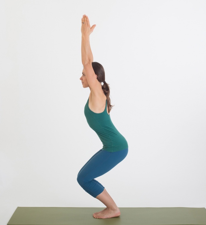 قفي بشكلٍ مستقيم وضميّ رجليك ثم انخفضي قليلاً وارجعي مؤخرتك الى الوراء، اثني ركبتيك كأنك تريدين الجلوس على كرسي وافتحي ذراعيك ومديهما الى الأعلى فوق رأسك كما في الصورة.